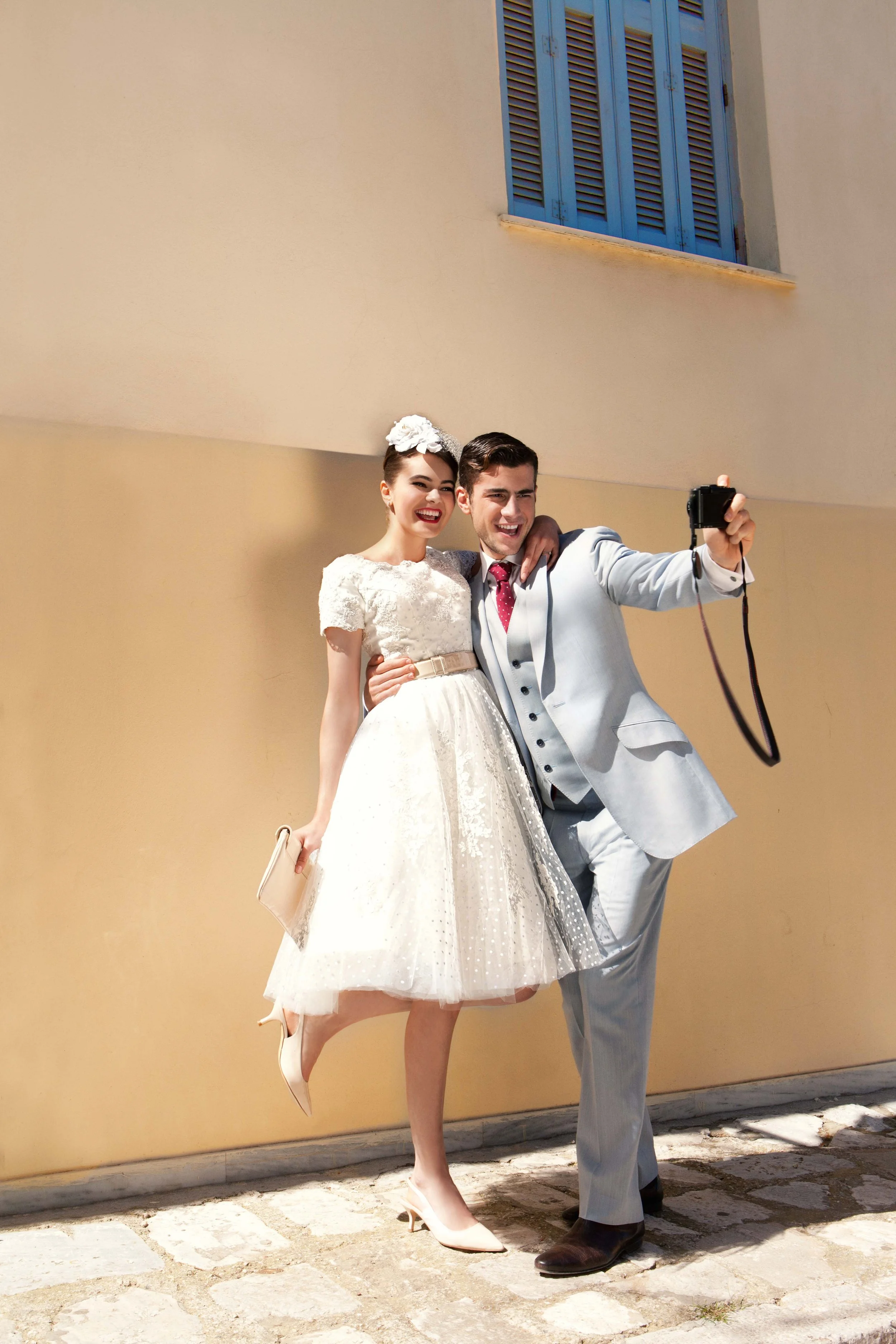 A couple dressed in wedding attire taking a selfie outdoors against a light-colored wall with a blue window above them, on a cobblestone street.