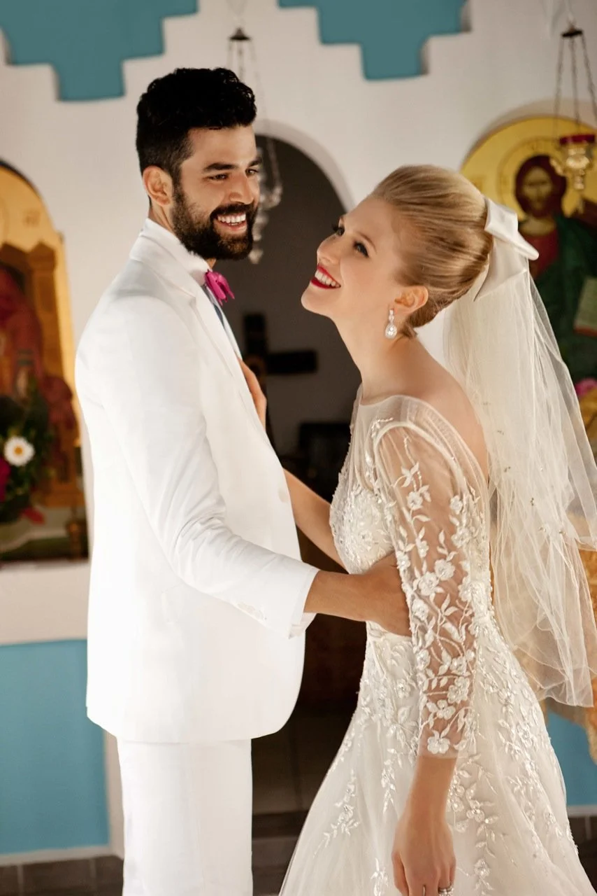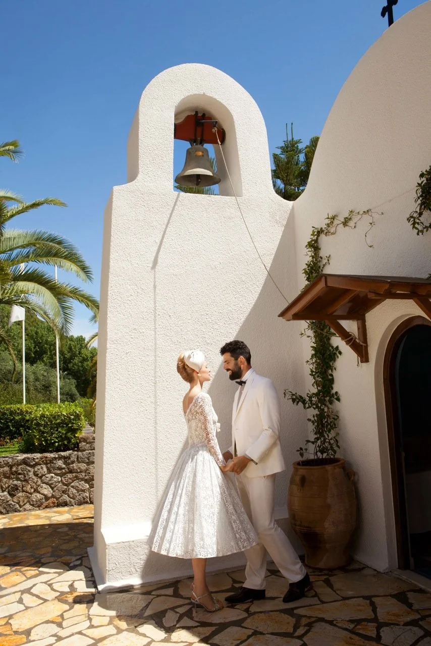 A bride and groom standing outside a white stucco building with a bell in a small tower, under a clear blue sky. The bride is wearing a white vintage-style dress with lace sleeves and a veil, and the groom is dressed in a white tuxedo with black shoe