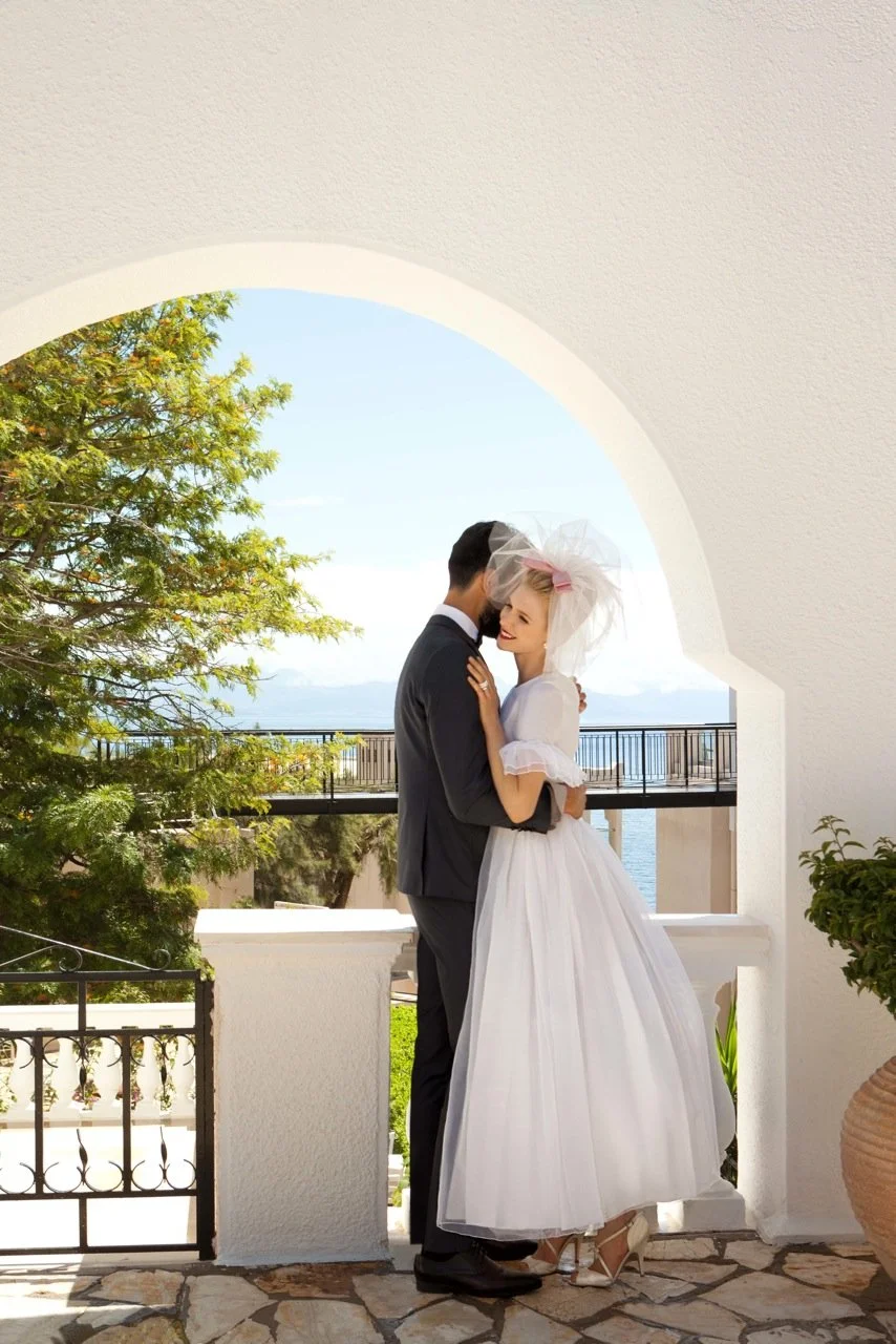 A bride and groom embrace on a balcony with scenic ocean view in the background, framed by a white archway.