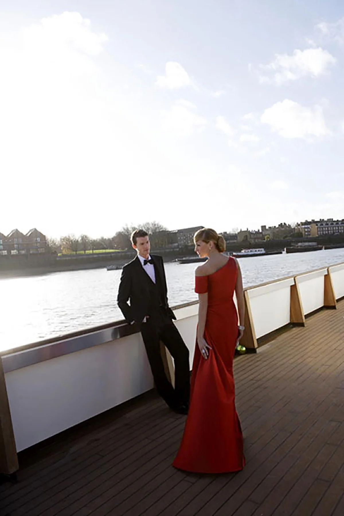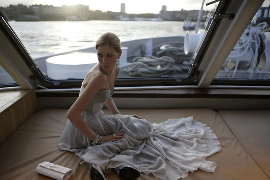 A woman in an elegant dress sitting on a boat's lounge area, with water and city skyline visible through the large windows behind her.