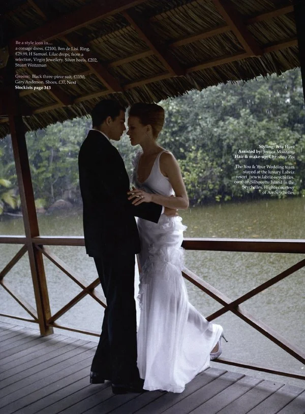A man in a black tuxedo and a woman in a white satin gown are standing in front of a vanity mirror with lights in a dimly lit room.