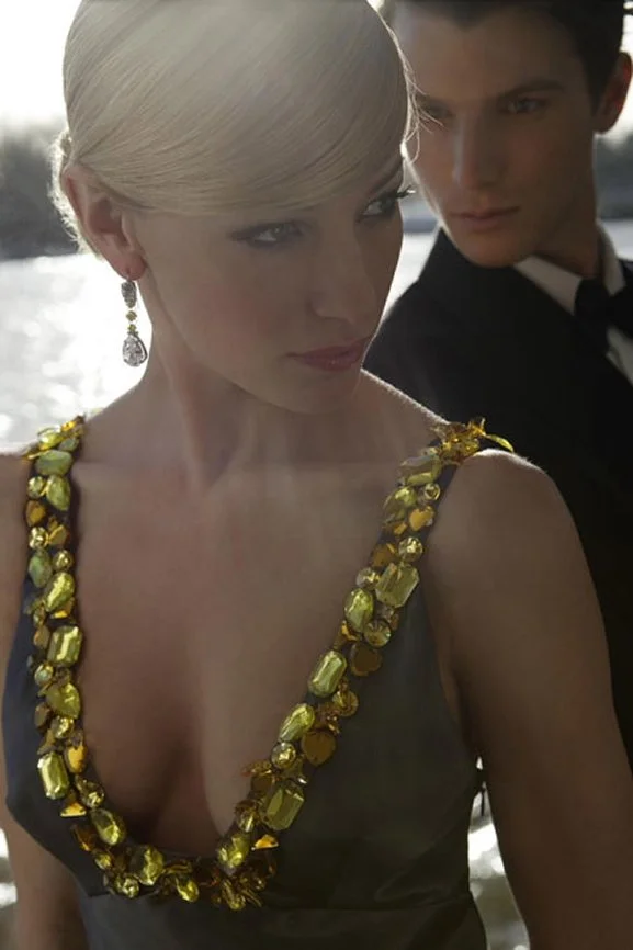 A woman with platinum blonde hair and earrings wearing a dress with a large yellow gemstone necklace, looking to her left. A man with dark hair in a tuxedo is in the background, looking at her.