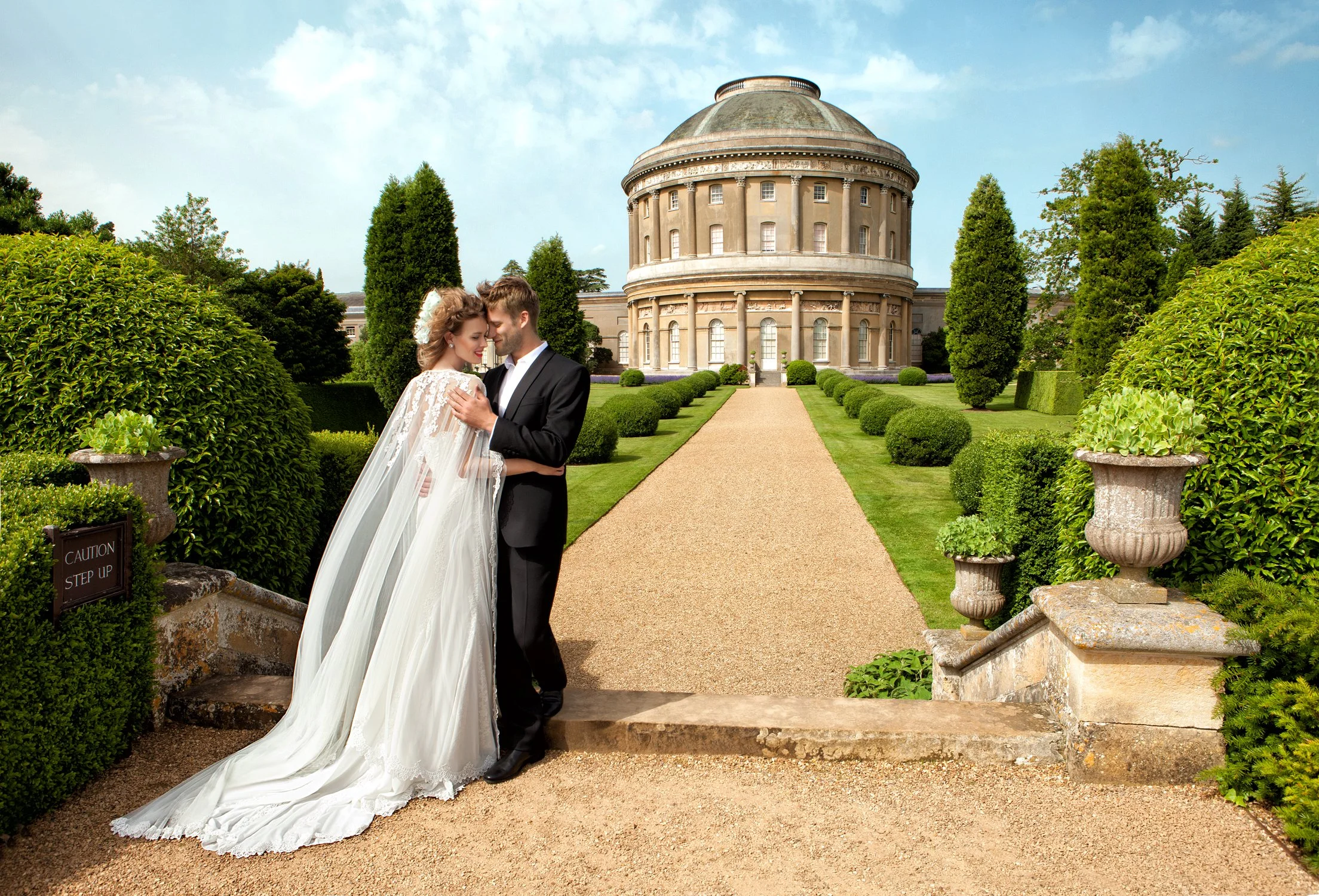 A bride and groom in wedding attire standing on a gravel pathway in front of a large neoclassical building with a domed roof, surrounded by manicured gardens and landscaping.