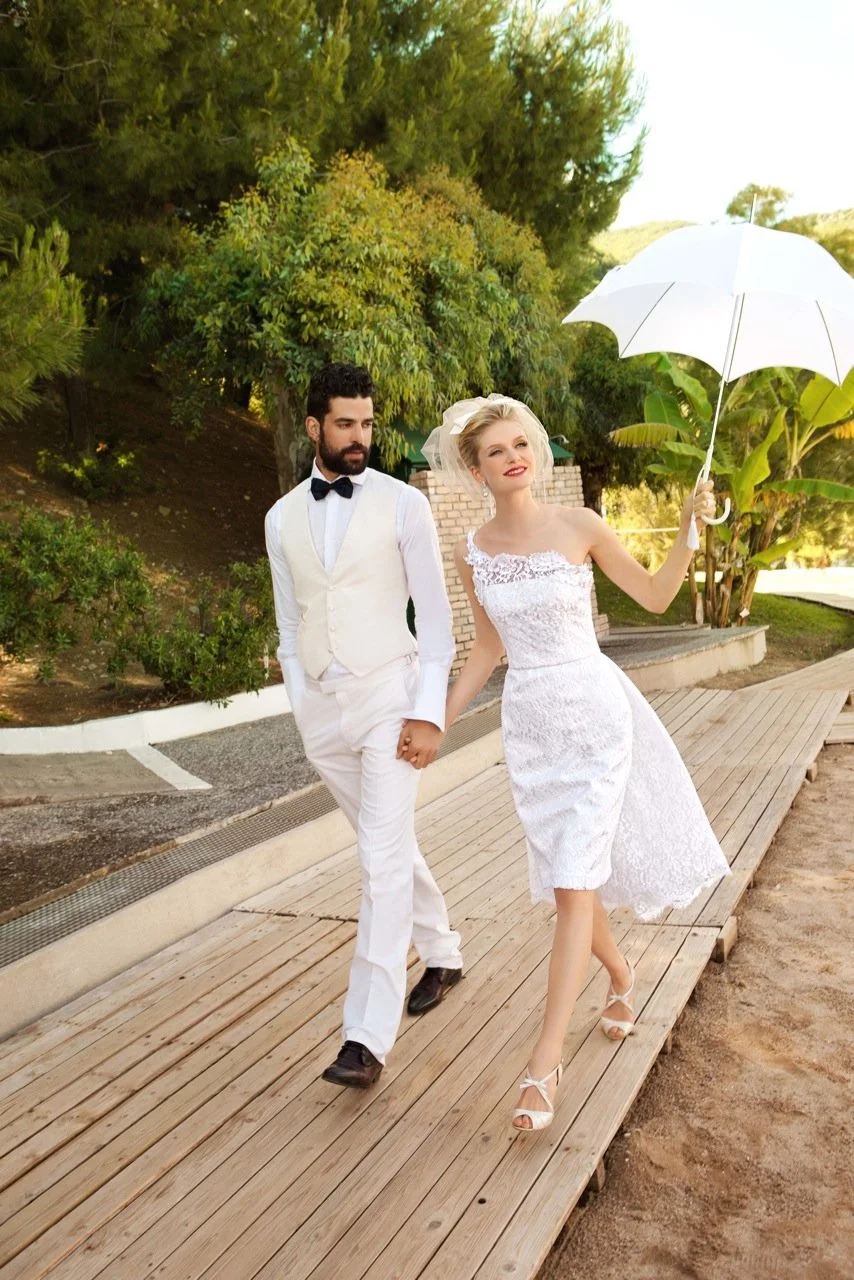 A bride and groom holding hands and walking outdoors on a wooden path, with the bride holding a white umbrella and dressed in a white lace wedding dress, and the groom in a white suit with a black bow tie, surrounded by greenery and trees.